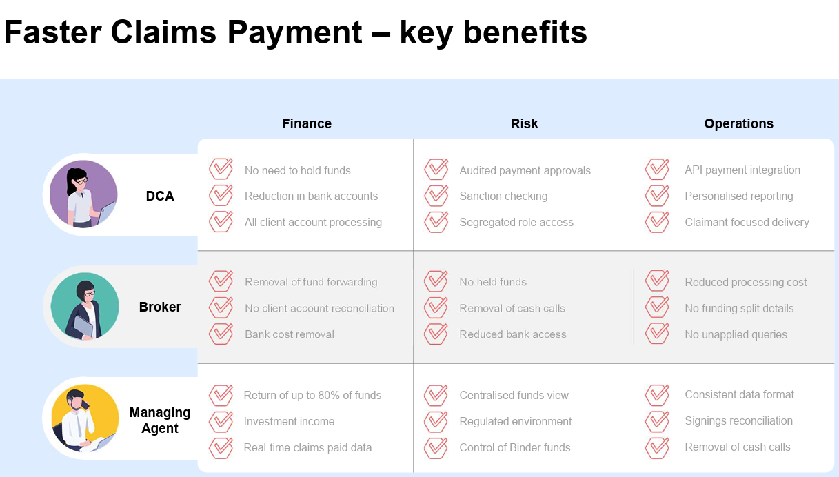 FCP represents the arrival of a transformative payment and treasury management technology to the Lloyd’s DA market. FCP gives managing agents (MAs) greatly enhanced flexibility and oversight in their capital management and provides all participants with real-time visibility over claims payments as well as an improved claimant payment experience.